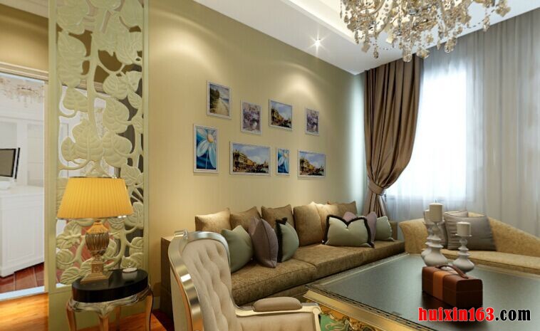 本套房屋装饰的色彩搭配可以带给人们一种非常华丽的感觉,电视背景墙上粘贴了一款银色带有黄色花纹的壁纸做装饰,搭配上石膏板吊顶上的射灯更可以带给人们一种华美、高贵的感觉,电视下方摆放了一款纯白色的电视柜做装饰,纯白色的设计与银黄色的壁纸搭配在一起将设计感全部都展现了出来,与之相对的沙发背景墙上的设计则比较简单,米黄色的墙壁漆刷涂了整个墙壁,并在上面悬挂了多幅装饰画,相框大小不一,灵活的设计显得更加时尚,一侧安装了一块镂空木板做装饰,唯美的图案更为设计增添美感,餐厅中的装饰则比较温馨、浪漫,一款纯白色的餐桌搭配上青绿色的座椅,一定会带给人们一种清新感,同时也使餐厅空间显得更加干净。