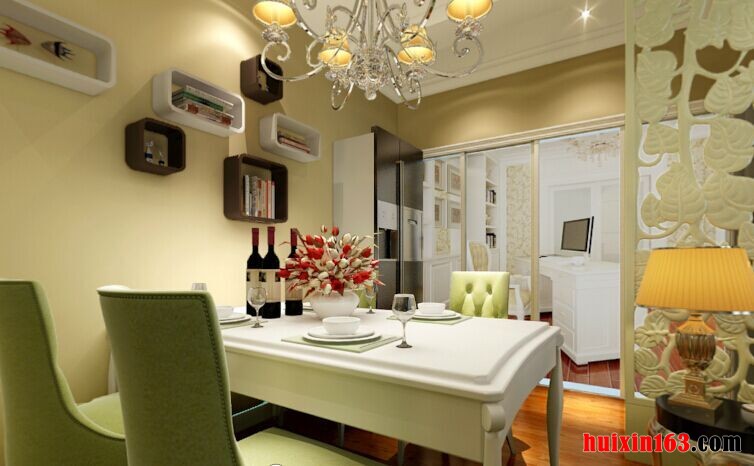 本套房屋装饰的色彩搭配可以带给人们一种非常华丽的感觉,电视背景墙上粘贴了一款银色带有黄色花纹的壁纸做装饰,搭配上石膏板吊顶上的射灯更可以带给人们一种华美、高贵的感觉,电视下方摆放了一款纯白色的电视柜做装饰,纯白色的设计与银黄色的壁纸搭配在一起将设计感全部都展现了出来,与之相对的沙发背景墙上的设计则比较简单,米黄色的墙壁漆刷涂了整个墙壁,并在上面悬挂了多幅装饰画,相框大小不一,灵活的设计显得更加时尚,一侧安装了一块镂空木板做装饰,唯美的图案更为设计增添美感,餐厅中的装饰则比较温馨、浪漫,一款纯白色的餐桌搭配上青绿色的座椅,一定会带给人们一种清新感,同时也使餐厅空间显得更加干净。