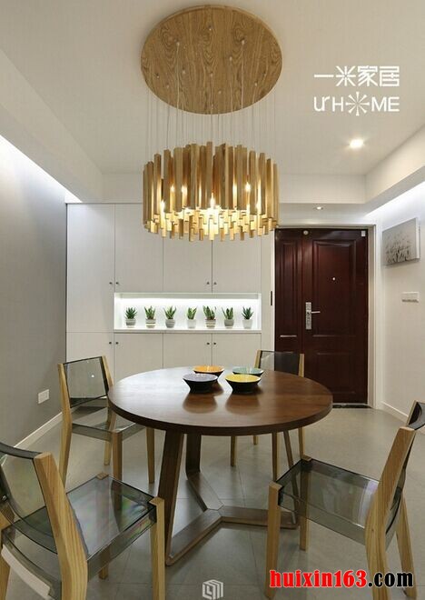 本套房屋装饰的风格比较注重时尚色彩,不喜繁杂的装饰,只要用简单的装饰材料在恰当的地方做出简单的设计即可,客厅中的面积比较大与餐厅在同一空间内,比较具有特点的设计便是电视背景墙的装饰,在电视的上下做出了格架设计,平板白墙上不添加多余的色彩修饰,黑色的组合柜摆放在电视下方,不仅在装饰上起到了一定效果,更可以增加客厅的收纳空间,电视上方的黄色吊柜,原本也是黑色的,但由于房屋的整体色调太偏向与黑白两色,那面会显得单调一些,所以设计师选用了一款暖黄色的柜门做了装饰,整体上起到了点缀的效果,同时暖黄色也可以带给人们一种温馨感,沙发的搭配也比较随意,黑色皮质沙发搭配上深灰色的布艺沙发凳,这样的组合搭配,展现给我们的便是一种高贵与舒适。