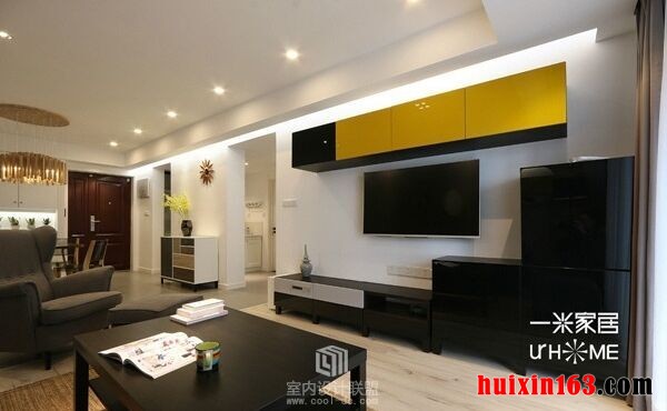 本套房屋装饰的风格比较注重时尚色彩,不喜繁杂的装饰,只要用简单的装饰材料在恰当的地方做出简单的设计即可,客厅中的面积比较大与餐厅在同一空间内,比较具有特点的设计便是电视背景墙的装饰,在电视的上下做出了格架设计,平板白墙上不添加多余的色彩修饰,黑色的组合柜摆放在电视下方,不仅在装饰上起到了一定效果,更可以增加客厅的收纳空间,电视上方的黄色吊柜,原本也是黑色的,但由于房屋的整体色调太偏向与黑白两色,那面会显得单调一些,所以设计师选用了一款暖黄色的柜门做了装饰,整体上起到了点缀的效果,同时暖黄色也可以带给人们一种温馨感,沙发的搭配也比较随意,黑色皮质沙发搭配上深灰色的布艺沙发凳,这样的组合搭配,展现给我们的便是一种高贵与舒适。
