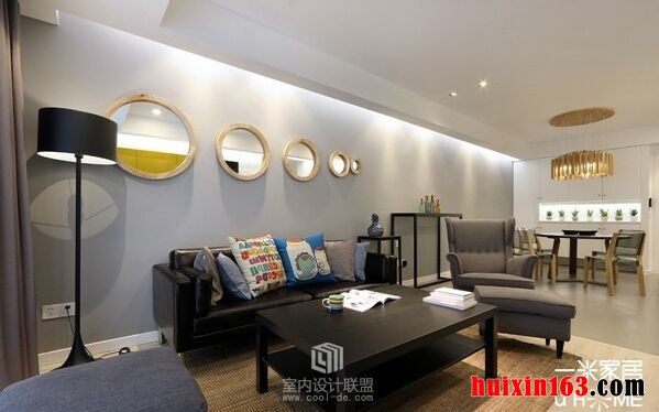 本套房屋装饰的风格比较注重时尚色彩,不喜繁杂的装饰,只要用简单的装饰材料在恰当的地方做出简单的设计即可,客厅中的面积比较大与餐厅在同一空间内,比较具有特点的设计便是电视背景墙的装饰,在电视的上下做出了格架设计,平板白墙上不添加多余的色彩修饰,黑色的组合柜摆放在电视下方,不仅在装饰上起到了一定效果,更可以增加客厅的收纳空间,电视上方的黄色吊柜,原本也是黑色的,但由于房屋的整体色调太偏向与黑白两色,那面会显得单调一些,所以设计师选用了一款暖黄色的柜门做了装饰,整体上起到了点缀的效果,同时暖黄色也可以带给人们一种温馨感,沙发的搭配也比较随意,黑色皮质沙发搭配上深灰色的布艺沙发凳,这样的组合搭配,展现给我们的便是一种高贵与舒适。