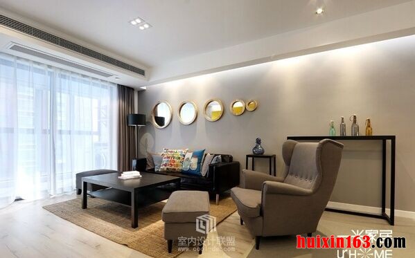 本套房屋装饰的风格比较注重时尚色彩,不喜繁杂的装饰,只要用简单的装饰材料在恰当的地方做出简单的设计即可,客厅中的面积比较大与餐厅在同一空间内,比较具有特点的设计便是电视背景墙的装饰,在电视的上下做出了格架设计,平板白墙上不添加多余的色彩修饰,黑色的组合柜摆放在电视下方,不仅在装饰上起到了一定效果,更可以增加客厅的收纳空间,电视上方的黄色吊柜,原本也是黑色的,但由于房屋的整体色调太偏向与黑白两色,那面会显得单调一些,所以设计师选用了一款暖黄色的柜门做了装饰,整体上起到了点缀的效果,同时暖黄色也可以带给人们一种温馨感,沙发的搭配也比较随意,黑色皮质沙发搭配上深灰色的布艺沙发凳,这样的组合搭配,展现给我们的便是一种高贵与舒适。