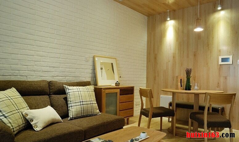 客厅中的装饰比较具有自然气息,沙发背景墙的装饰比较具有仿古特色,白漆砖墙的设计自然会使人们眼前一亮,同时也可以带给人们一种亲切感,一款深棕色的棉麻布艺沙发靠墙而放,上面还搭配了一款白色带有格子图案的布艺抱枕,在舒适之余又可以带给人们一种清新感,这样可以使在外忙碌一天的人们回到家中感到身心放松,从而可以更好的享受休息时光,,一侧装饰比较自然的餐厅,可以带给人们布艺样的享受,原木材质的墙壁以及吊顶,比较具有设计感,而且原木材质也更可以带给人们一种大自然的清新,房屋不需要过多的修饰,就可以将设计感全部都展现出来,卧室的设计主要是以舒适为主,素雅的色彩搭配上柔软的床饰,这便是理想中家的感觉。