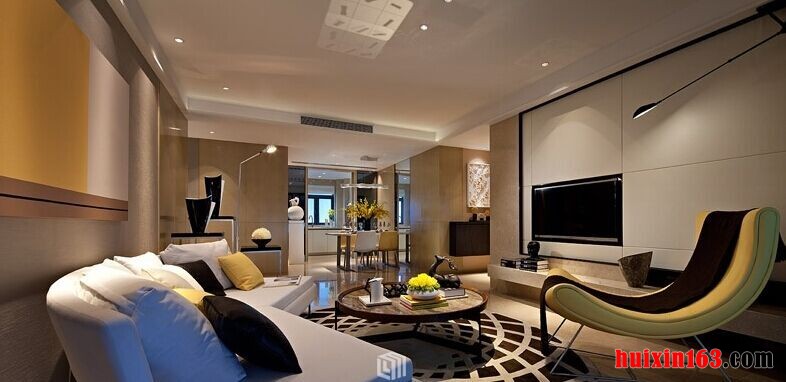 本套房屋装饰的色彩搭配与运用不喜华丽也不喜张扬,客厅中的灯光效果比较暗,这样可以在视觉上带给人们一种迷离的感觉,朦朦胧胧的昏暗也为客厅增添了一丝神秘感,平顶式的石膏板吊顶上镶嵌了一盏灯饰,并在四周安装了一圈白色的射灯,昏暗的灯光,搭配上白色的墙壁,更加凸显出了时尚的设计感,电视背景墙上的装饰比较简单,平板式的设计,将电视镶嵌在其中,这样的设计比较独特,也是背景墙设计的一大亮点,与之相对的沙发背景墙则会显得更加抽象,白黄对半的装饰面板悬挂在装饰背景墙上,可以带给人们更多的幻想,一款白色的布艺沙发质地柔软,搭配上黑色以及黄色的抱枕,更是将柔软舒适的质感展现的淋漓尽致。
